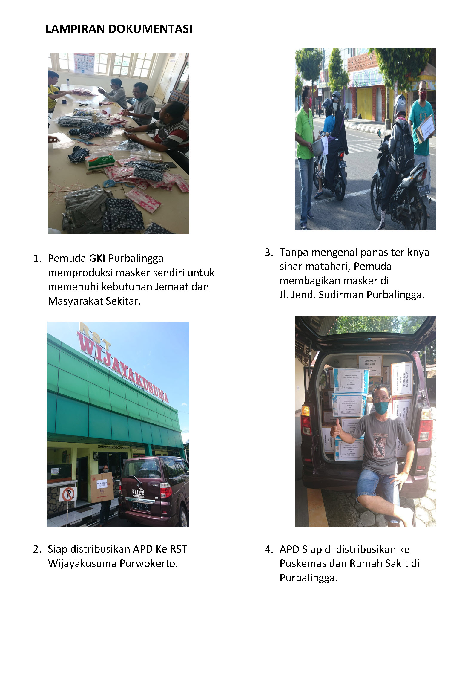Sebagai Gereja Tuhan, GKI Purbalingga berusaha untuk hadir, ikut ambil bagian dalam meredam kepanikan yang terjadi, sekaligus ikut ambil bagian program Pemerintah dalam memerangi Virus Corona. Untuk itu GKI Purbalingga mengerahkan Pemuda Gereja, untuk menyikapi akan suasana yang terjadi, dengan membuat Masker dan menyediakan cairan desinfektan untuk dibagikan ke jemaat dan masyarakat sekitar, serta membuat Face Shield untuk Rumah sakit dan Puskesmas di seluruh Kabupaten Purbalingga, bahkan sampai ke Rumah Sakit di Parakan, Wonosobo, Banjarnegara, Banyumas, Purwokerto, Dan Cilacap.