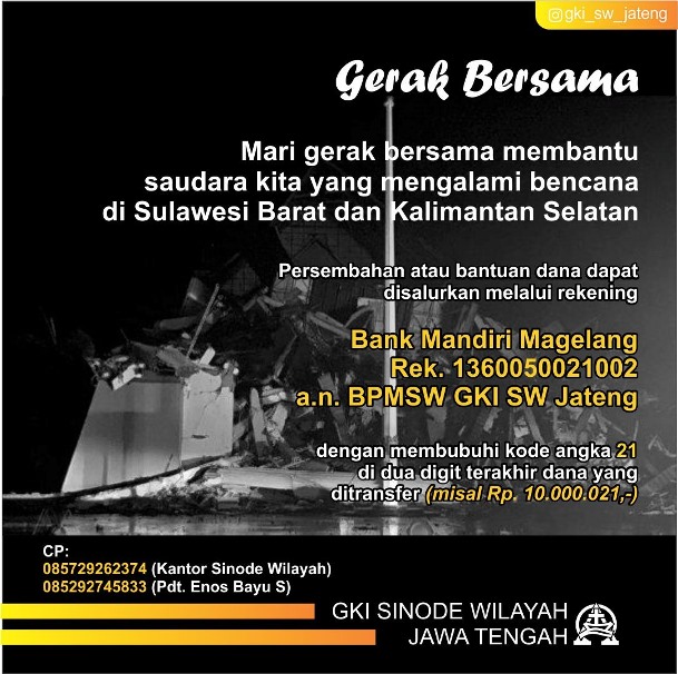 Departemen Kesaksian Pelayanan (DKP) GKI Sinode Wilayah (Sinwil) Jateng bersama Sinwil Jabar dan Jatim berupaya bersama membantu Saudara-saudara di Sulawesi Berat dan Kalimantan Selatan. TIM GKI (Gerakan Kemanusiaan Indonesia) dan DKP sudah memulai memberikan bantuan ke Mamuju, Sulawesi Barat melalui jemaat GKSB (Gereja Kristen Sulawesi Barat). DKP memberikan bantuan ke Kalimantan Selatan melalui jemaat GKE Eben Ezer Banjarmasin. Selanjutnya kita masih akan memberikan bantuan lanjutan. Mari kita bergerak bersama untuk membantu saudara kita yang sedang mengalami musibah bencana di Sulawesi Barat dan Kalimantan Selatan.