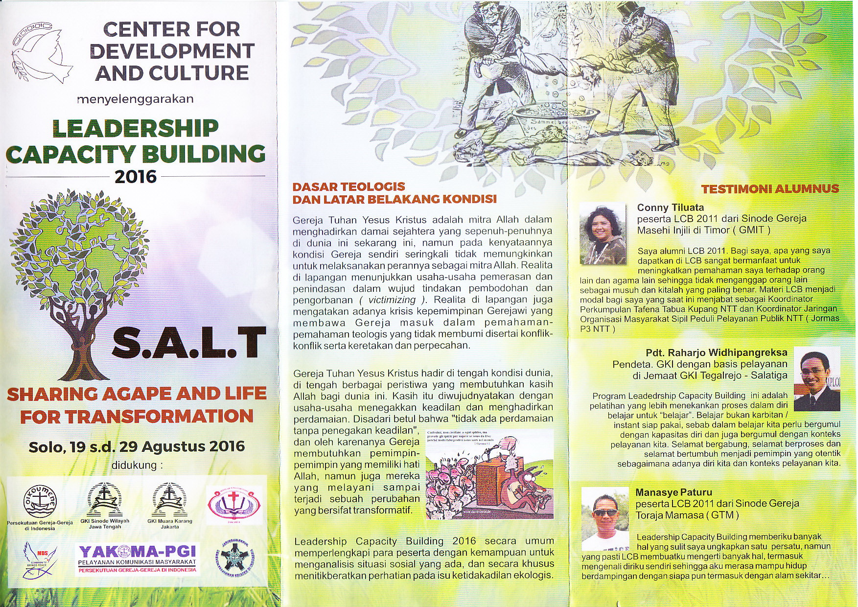 Leadership Capacity Building (LCB) kembali diadakan di tahun 2016 yakni di tanggal 19 - 29 Agustus 2016 di Solo, dengan tema : Sharing Agape And Life For Transformation (S.A.L.T).