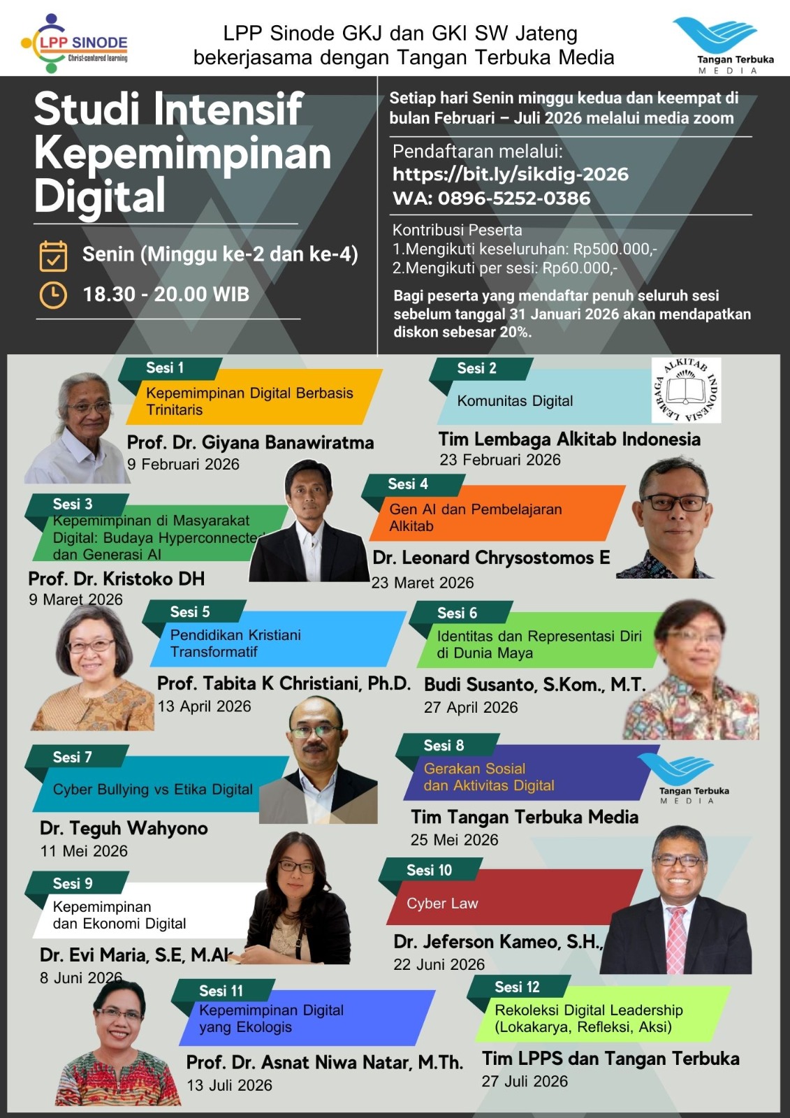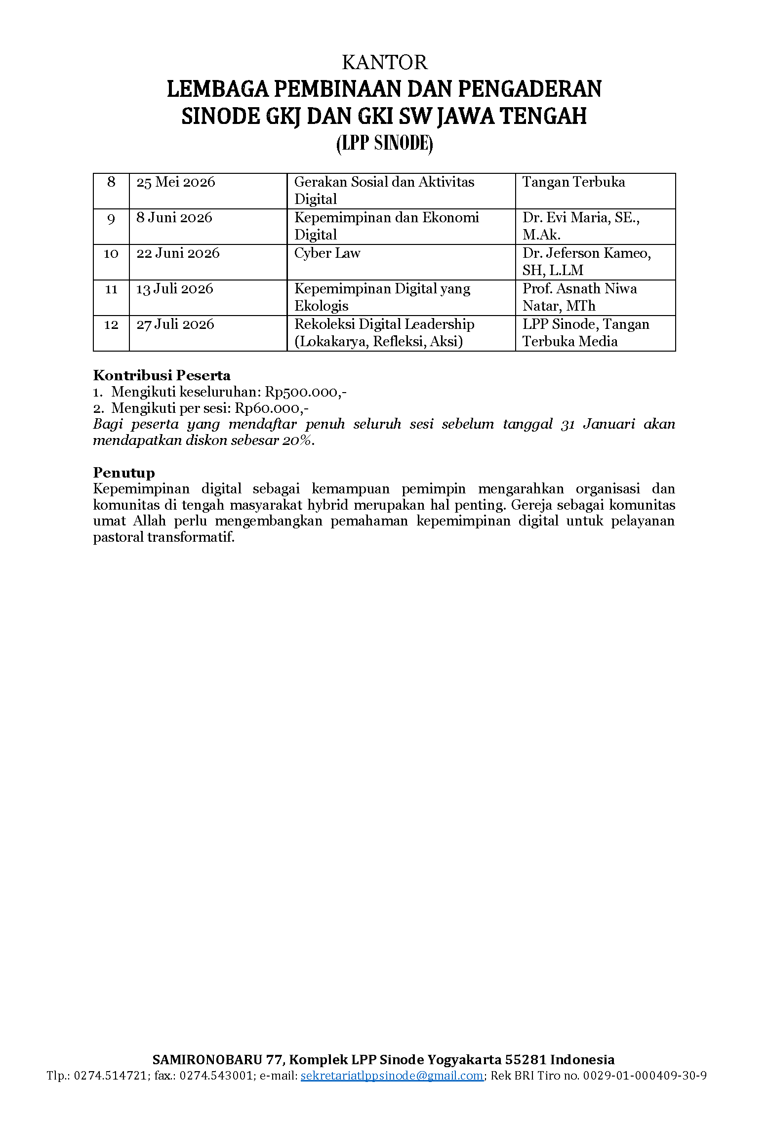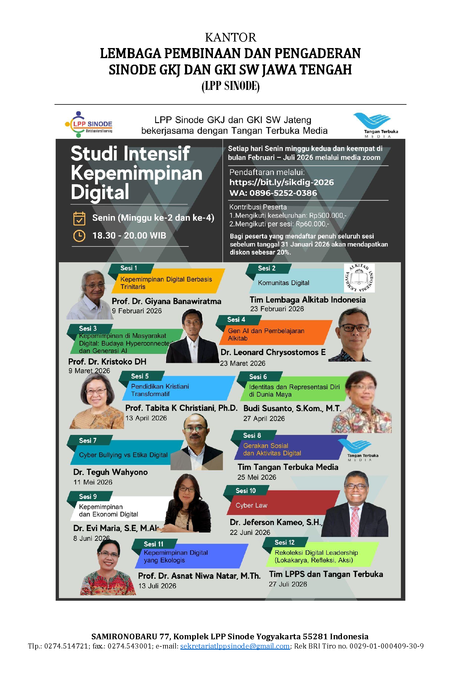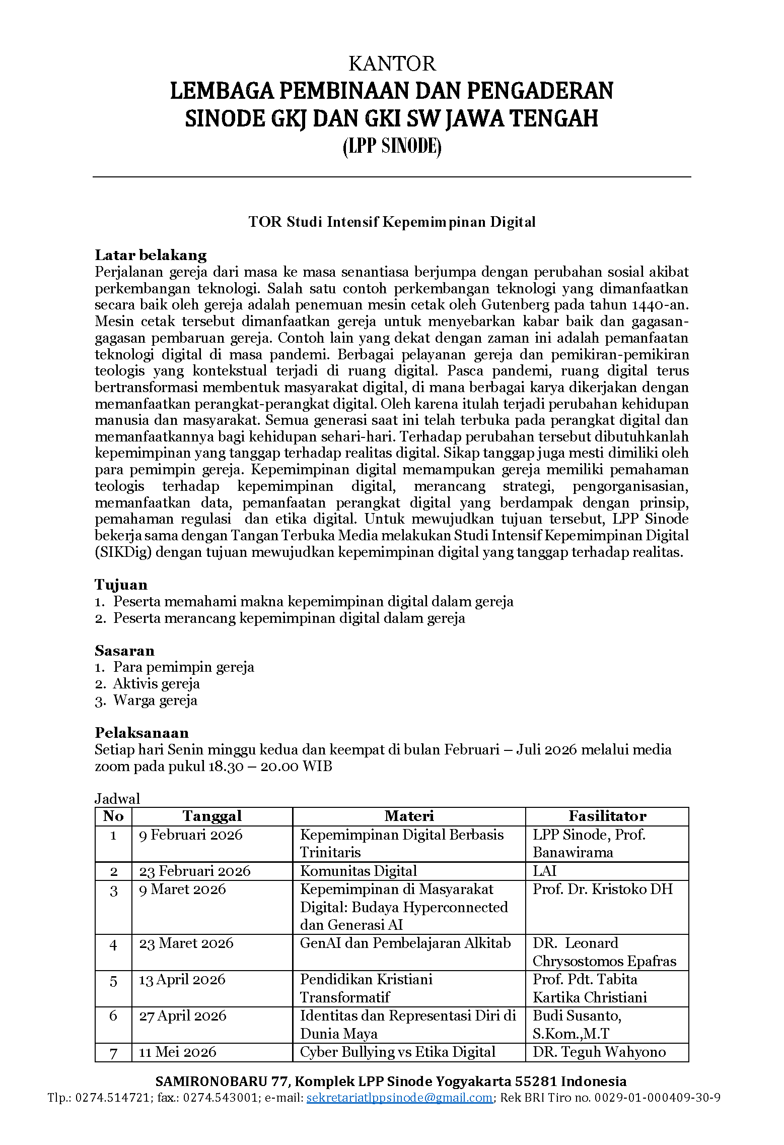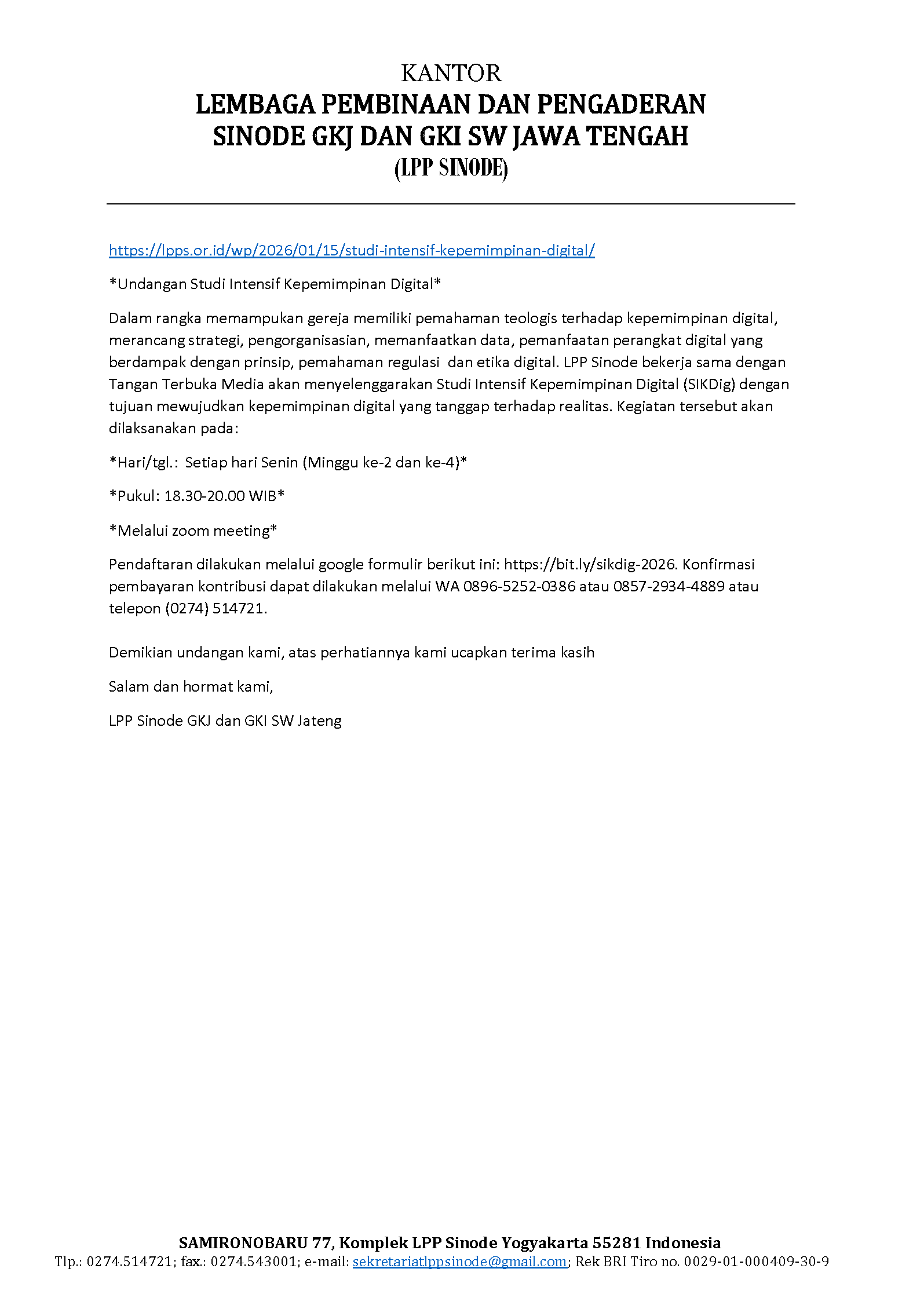 Kami informasikan untuk Kegiatan LPP Sinode GKJ dan GKI SW Jateng : "Undangan Studi Intensif Kepemimpinan Digital" yang akan dilaksanakan pada: