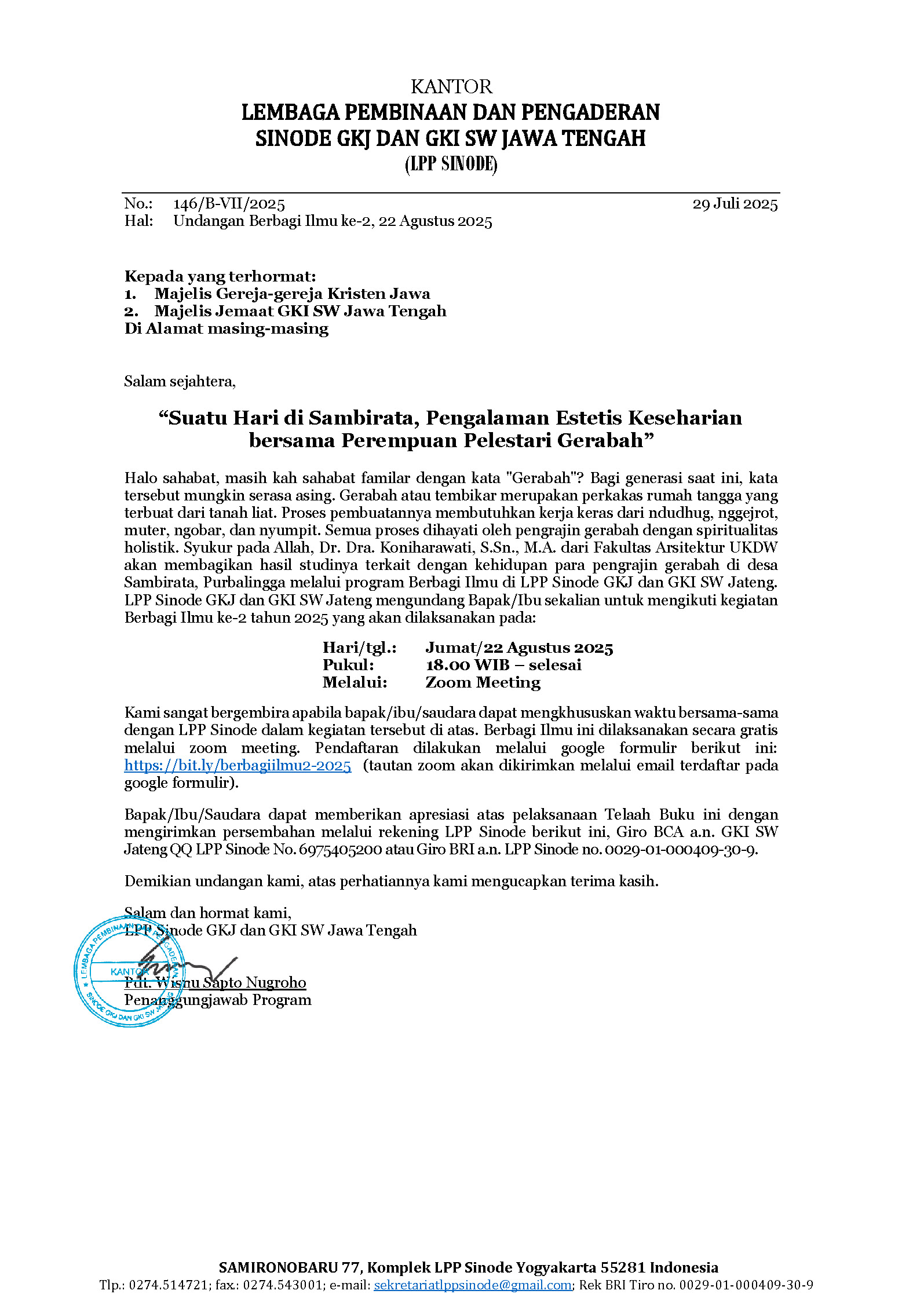 Kami informasikan kembali untuk beberapa kegiatan LPP Sinode GKJ dan GKI SW Jateng, yakni :