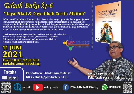 Bersama ini kemi informasikan Undangan Kegiatan dari LPP Sinode GKJ dan GKI SW Jawa Tengah mengundang Bapak/Ibu/Saudara sekalian untuk bergabung dalam kegiatan Telah buku ke-6 tahun 2021. Buku yang akan ditelaah adalah “Daya Pikat & Daya Ubah Cerita Alkitab”. Acara tersebut akan dilaksanakan pada: Jumat, 11 Juni 2021 pukul 10.00 – 12.00 WIB melalui zoom meeting