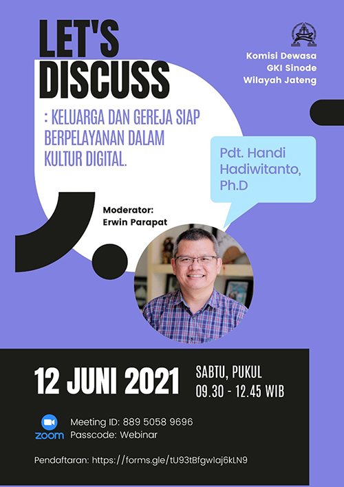 Perkenankanlah kami dari Komisi Dewasa-DPG BPMSW GKI SW Jateng menginformasikan acara Pembinaan Komisi Dewasa GKI lingkup SW JatengVia Zoom:“KELUARGA DAN GEREJA SIAP BERPELAYANAN DALAM KULTUR DIGITAL“ yang akan dilaksanakan pada :