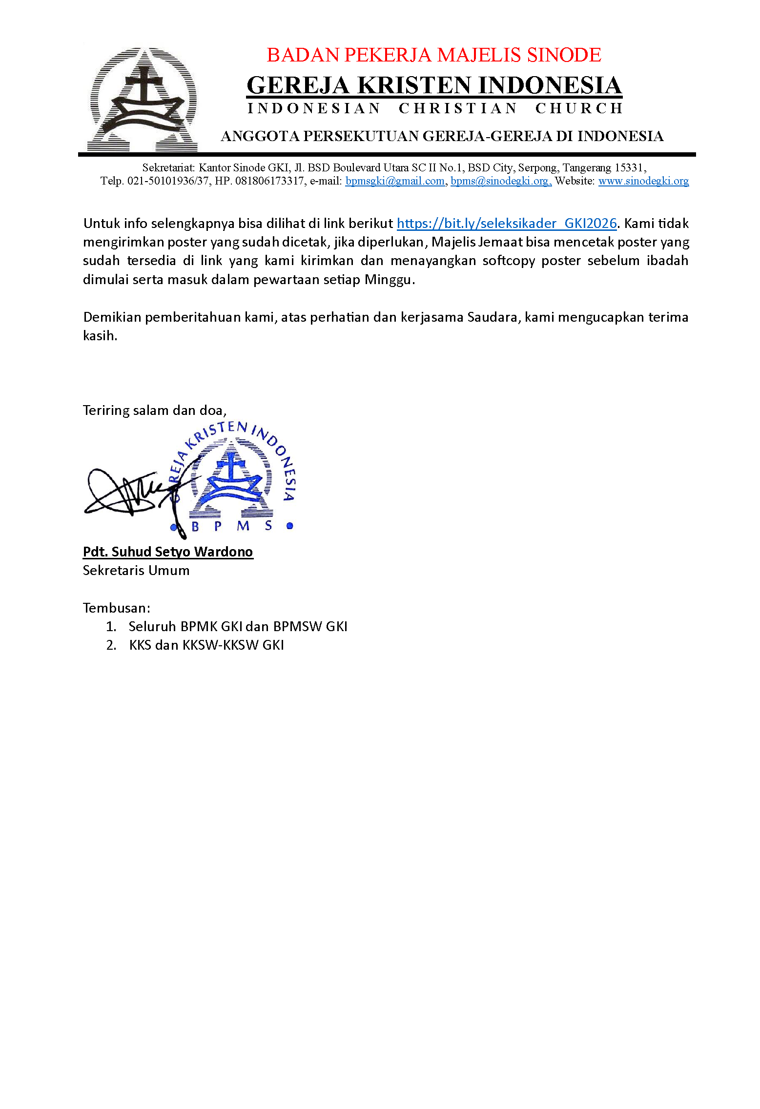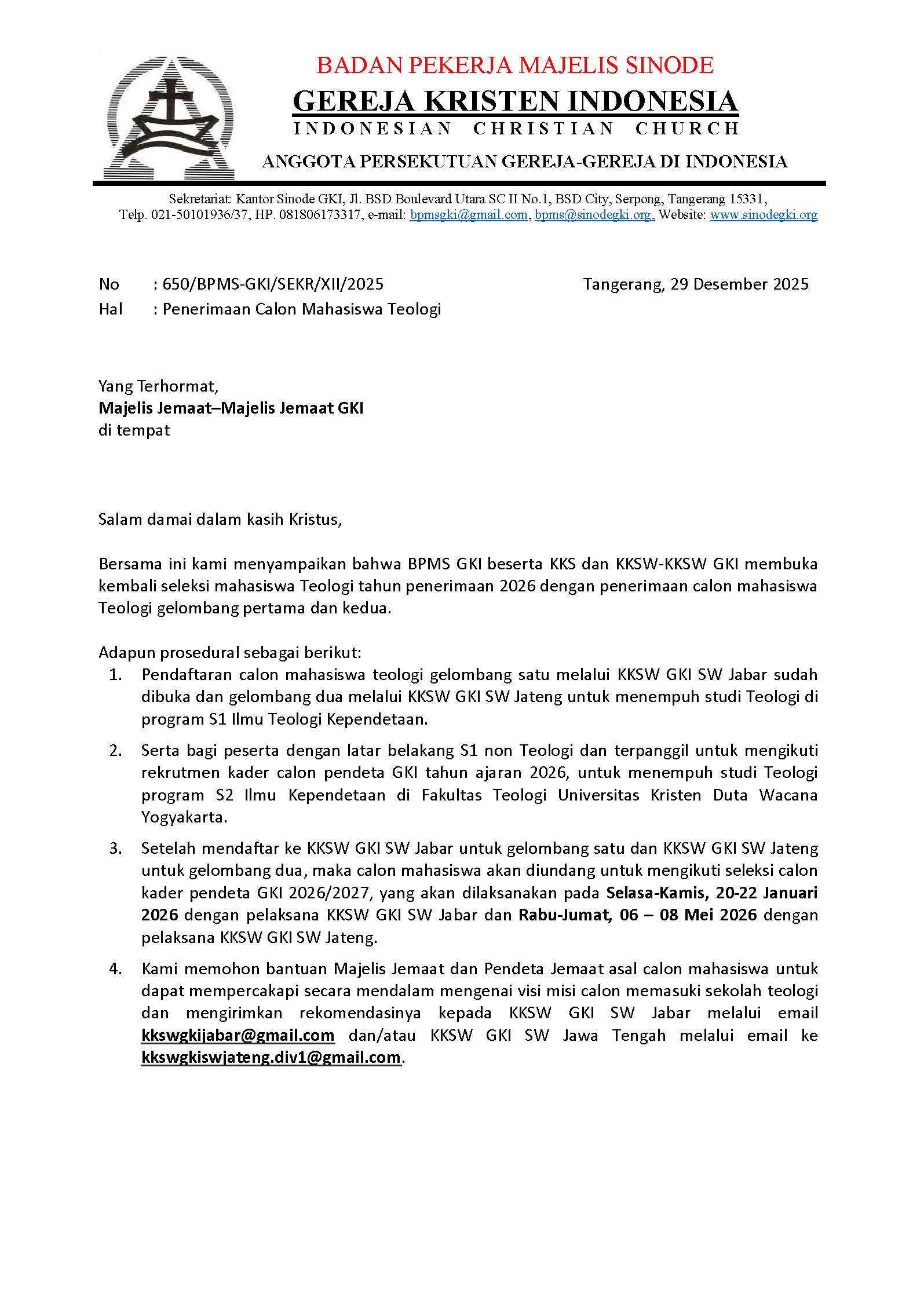 Dalam rangka rekrutmen Kader Calon Pendeta GKI, melalui Komisi Kependetaan Sinode Wilayah/KKSW GKI SW Jateng akan melaksanakan seleksi kader calon mahasiswa Teologi utusan GKI untuk tahun 2026.