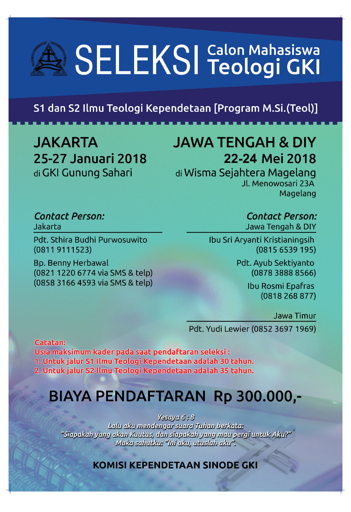 Komisi Kependetaan Sinode GKI kembali mengadakan Seleksi Calon Mahasiswa Teologi GKI pada tahun 2018.