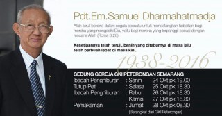 Telah Berpulang ke Rumah Bapa di Surga, Saudara kami terkasih Pdt. Em. Samuel Dharmahatmadja pada hari Senin, tanggal 24 Oktober 2016 pukul 13.30 WIB pada usia 78 tahun. Selamat berjumpa ...