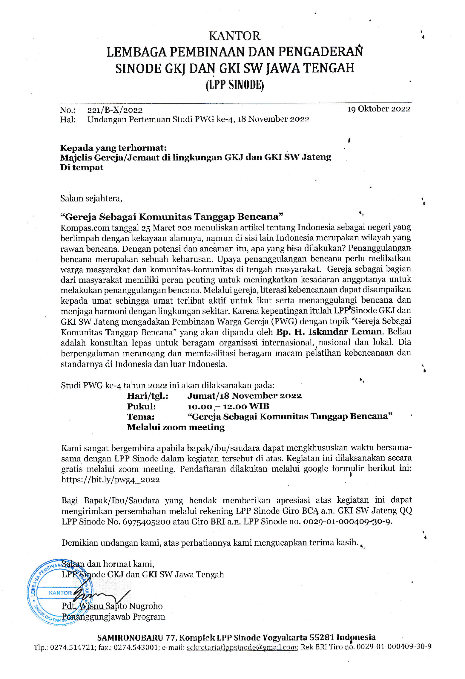 Kami informasikan kegiatan LPP Sinode GKJ dan GKI SW Jateng : "Studi PWG ke-4" dengan tema "Gereja sebagai Komunitas Tanggap Bencana", yang akan dilaksanakan pada hari Jumat, 18 November 2022 pukul 10.00 - 12.00 WIB melalui zoom meeting dengan narasumber Bp. H Iskandar Leman. Pendaftaran melalui https://bit.ly/pwg4_2022