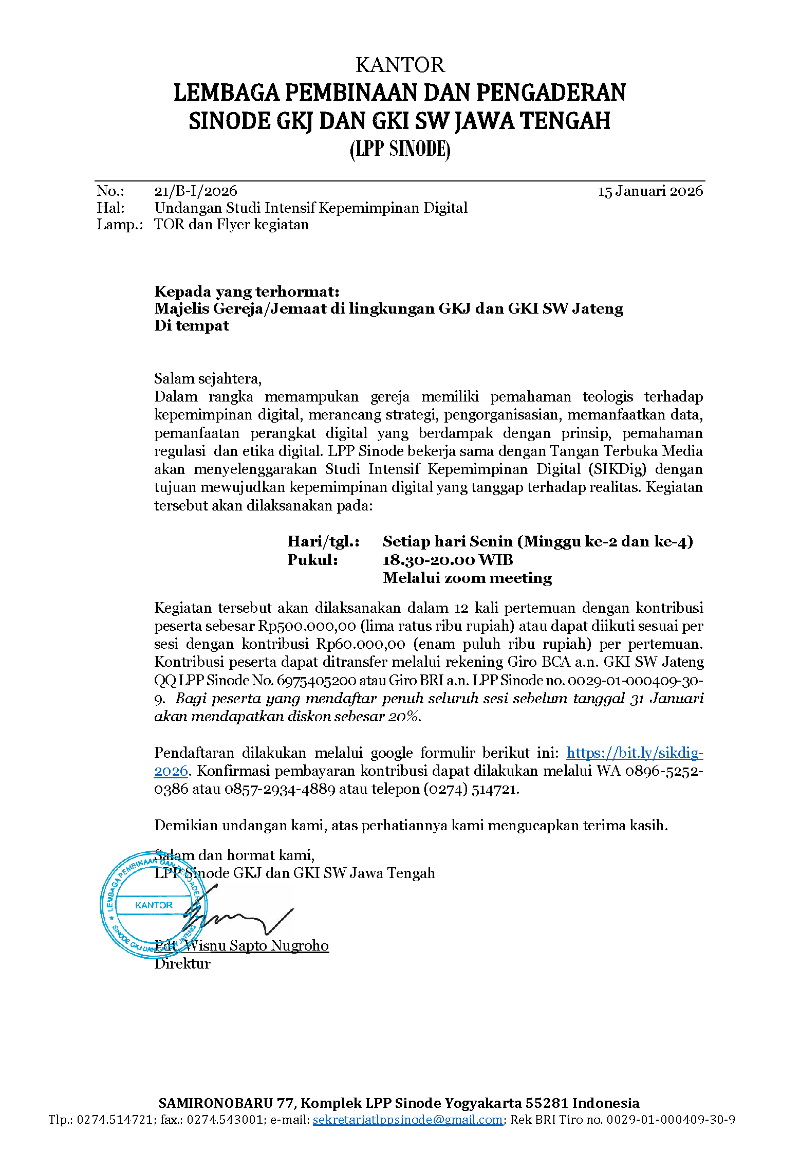 Kami informasikan untuk Kegiatan LPP Sinode GKJ dan GKI SW Jateng : "Undangan Studi Intensif Kepemimpinan Digital" yang akan dilaksanakan pada: