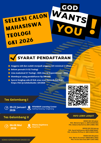Dalam rangka rekrutmen Kader Calon Pendeta GKI, melalui Komisi Kependetaan Sinode Wilayah/KKSW GKI SW Jateng akan melaksanakan seleksi kader calon mahasiswa Teologi utusan GKI untuk tahun 2026.